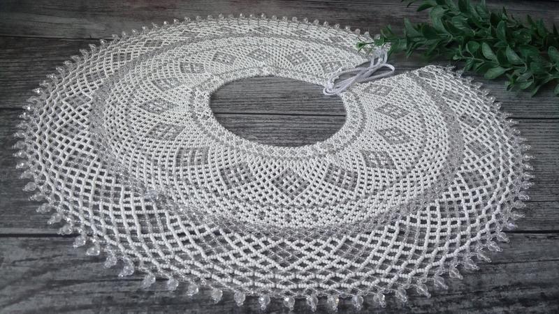 Білосніжка силянка з мотивами Лемківської кривульки. Довжина виробу навколо шиї -38см. Ширина -14,5см. Шнурочки по -30см, ними зручно регулювати довжину. Чеський бісер, кришталеві намистинки, міцна нитка. Товар виготовляється на замовлення