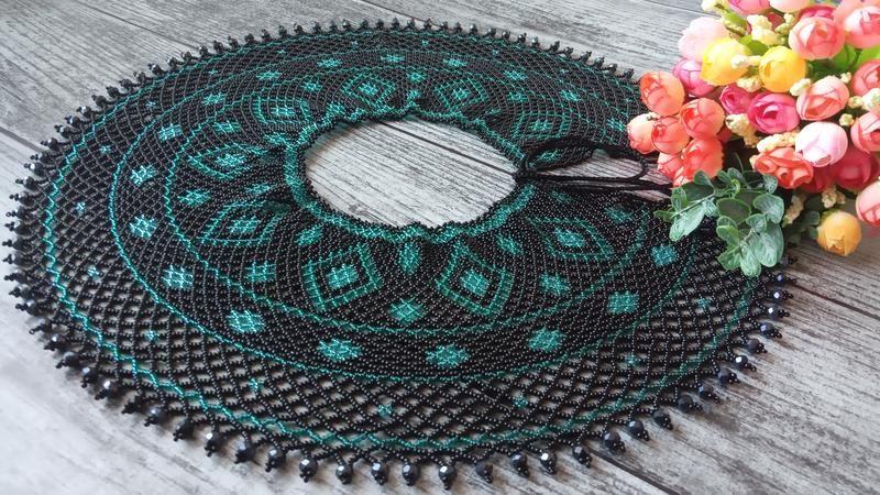 Довжина навколо шиї -38см. Ширина -13см. Зав"язки по-30 см, ними зручно регулювати довжину. Чеський бісер, кришталеві намистини, міцна нитка. Товар виготовляється на замовлення