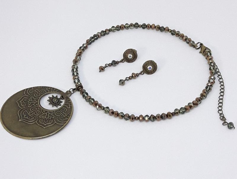 Кольє під шию з сережками-гвоздиками. Якщо обираєте для маленької принцеси, виглядади буде як на манекені. Для дорослих кол'є буде лежати більш до шиї. Виготовлено з скляних намистин ронделів, діаметром 6х4 мм., напівпрозорих зеленого кольору з гальванопокриттям на пів-намистини мідного кольору, на меморі-проволоці з додаванням металічної фурнітури кольору бронзи. 2 Кулони, з'єднані в один: підвіска сонце і кулон-квітка філігрань, діаметром 4,5 х 5,0 см. Довжина намиста 38 см. + ланка-подовжувач на замку 8 см.(дає можливість подовжити в більшу сторону намисто). Серьги-гвоздики, длина 3,0 см. от ушки. Дополнительные характеристики: Цвет : Зеленый Камни / вставки : Стразы Материал : Стекло