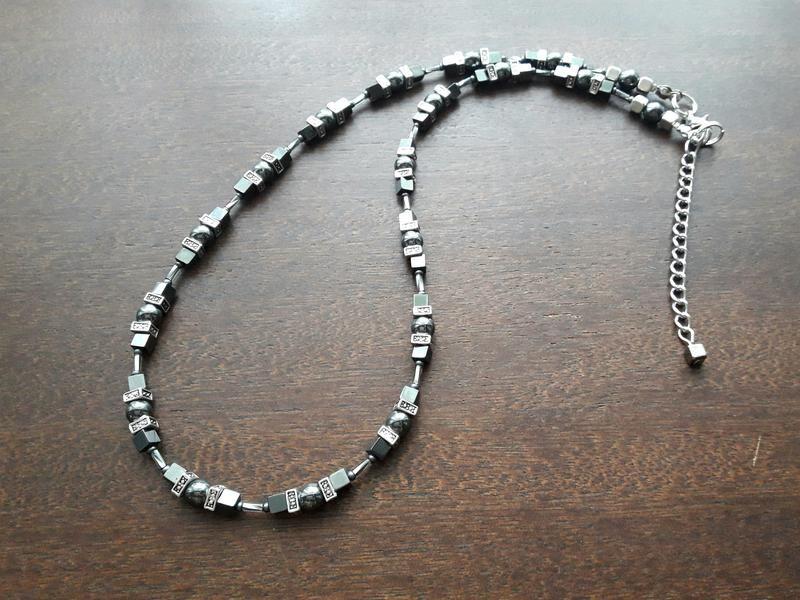 Материалы: Бусины гематита 6 мм.; гематит "кубик" 4х4 мм.; железные бусины "кубик" 4х4 мм.; разделителей квадратных железных, 5х5 мм., цвета стали; чешский бисер и стеклярус цвета серебра; фурнитура цвета серебра. Длинна 45 см. + 5 см. (цепочка-удлинитель). Дополнительные характеристики: Цвет : Серый Цвет : Черный Камни / вставки : Гематит Материал : Бисер Материал : Бусины Материал : Стекло