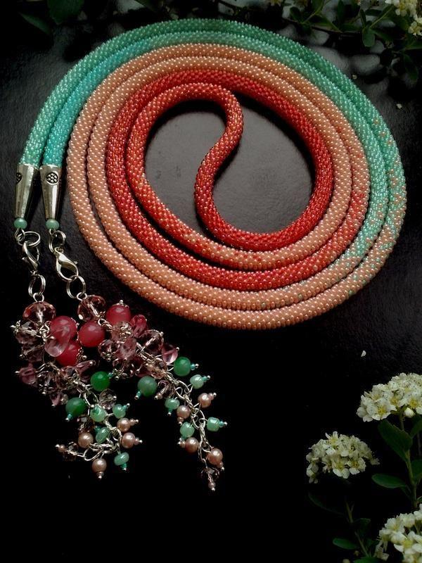 Ларіат з чеського якісного бісеру, зв′язаний на хлопковій нитці. Відтінкі бісеру ніжного м′ятного та рожевих кольорів нагадують кольори весняного квітучого саду. Довжина джгута 180 см, підвіски по 8 см. Для підвісок використані сколи рожевого кварцу та скляні чеські намистини, якісна фурнітура. Підвіски відстібуються. Ларіат можна заплітати у косу, робити різні вузли і таким чином кожного разу створювати новий образ, виглядати стильно і яскраво. Ларіат також буде гарним подарунком для жінкі будь-якого віку. Для покупців ларіатів я висилаю детальну інструкцію як зав′язувати та носити ларіати. Доставка новой почтой за счет получателя после предоплаты на карту ПБ, также возможна оплата наложенным платежом. Товар под заказ