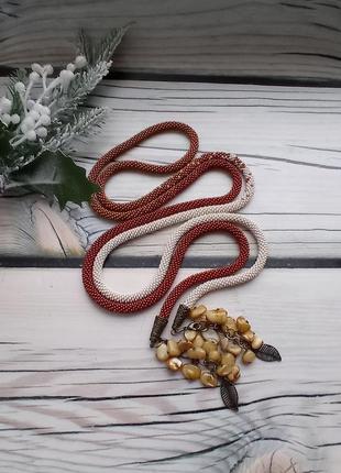 Ларіат з чеського якісного бісеру, зв′язаний на хлопковій нитці. Довжина джгута 165 см, підвіски по 6 см. Для підвісок використані намистини з натурального перламутру (тонованого), якісна латунна фурнітура. Підвіски відстібуються. Ларіат можна заплітати у косу, робити різні вузли і таким чином кожного разу створювати новий образ, виглядати стильно і яскраво. Ларіат також буде гарним подарунком для жінкі будь-якого віку. Для покупців ларіатів я висилаю детальну інструкцію як зав′язувати та носити ларіати.