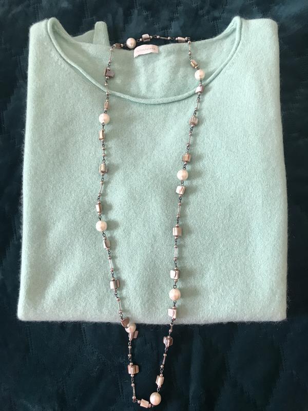 Удлиненное колье из кусочков из натурального перламутра, искусственных перламутровых бусин,та серебристых металлических бусинок.