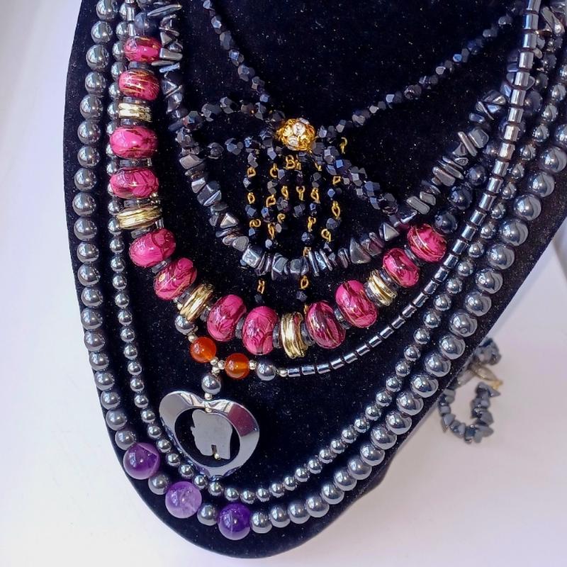 Ожерелья винтажные. Есть гематит, вулканический камень, аметист, шпинель. Все украшения приобретались в Германии. На каждом фото видны длину и цена. Если нужно - вышлю отдельно фото как выглядит на теле, или какой размер бусины.