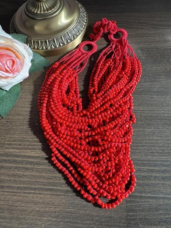 Авторське намисто "Коралики" з бісеру та бавовняної пряжі. Підходить як самостійне, або як основа під інші намиста. Довжина регулюється зав'язками.
