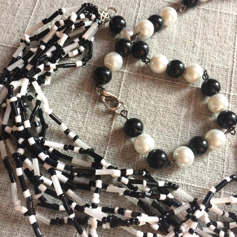 Колье «Ин-янь » Длина 60см Использованы бусины «под жемчуг», ассорти бисера и стекляруса, штифты Дополнительные характеристики: Материал : Бисер Материал : Бусины Материал : Металлическая фурнитура