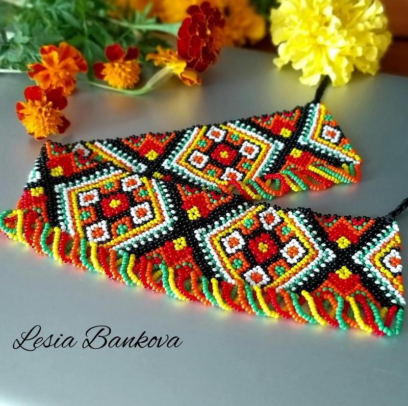 Работа изготовлена из чешского бисера на прочной нити. Ширина 5см.Длина 34см регулируется связями. Товар под заказ