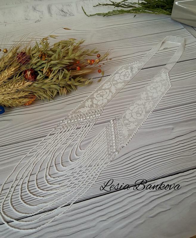 Работа изготовлена из чешского бисера на прочной нити. Ширина плетеной части 4.5 см. Товар под заказ