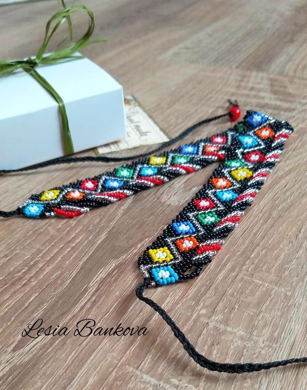 Работа сделана из чешского бисера. Ширина 2.5см. Длинна 33 + удлинение завязками. Товар под заказ
