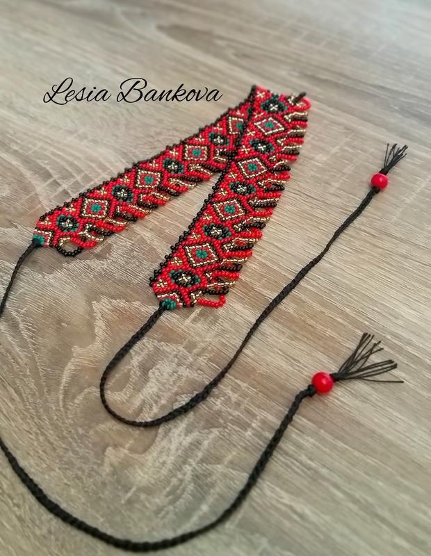 Робота виготовлена з чеського бісеру на міцній нитці. Довжина 32см , ширина 3.5см. Шнурівками можна регулювати довжину. Товар под заказ