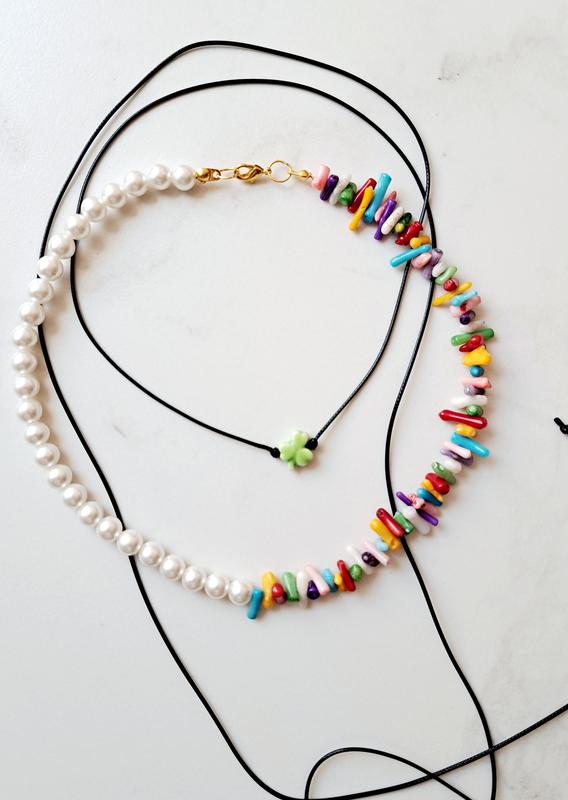 Пропоную вам намисто ручної роботи , довжина виробу 40 см , штучни перлини і натуральні коралі , в комплекті підвіс листочок конюшини керамічний довжина 1 метр 32 см.