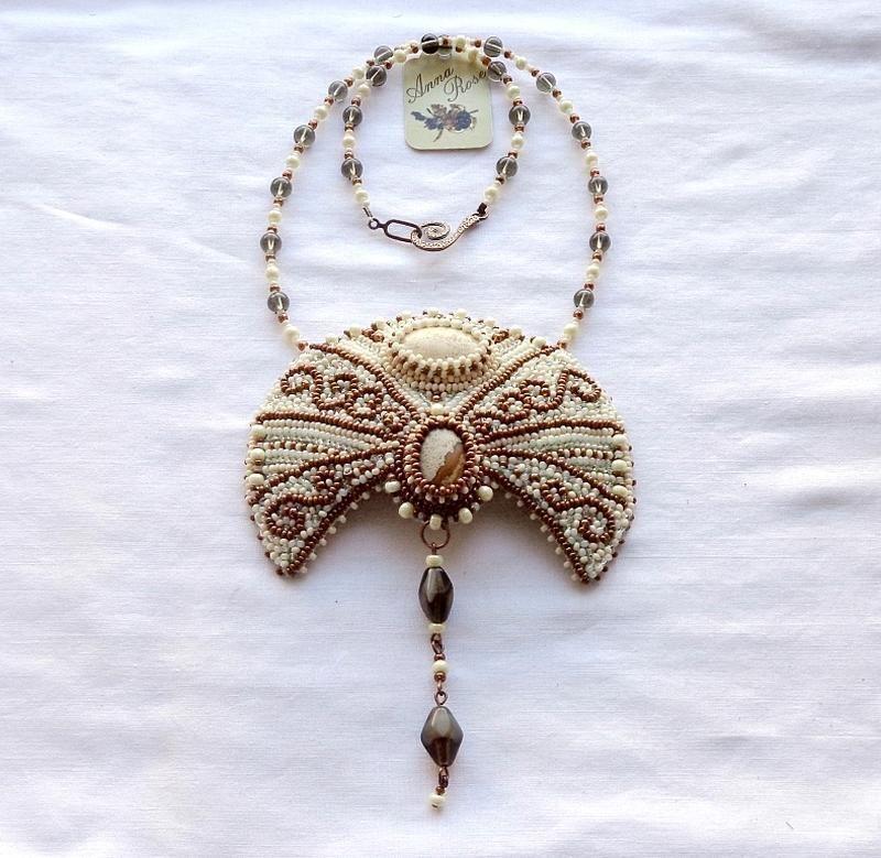 Колье из разноцветного чешского бисера: бежевого, кремового и бронзового цвета. Основной акцент - кабошон, оплетённый бисером. Композиция дополнена стеклянными бусинами. Подвеска с кабошоном - пейзажная яшма - размер камня 3 см на 2,5 см. и 1.8 см на 1.5 см. Обратная сторона подвески - натуральная кожа. Застежка - крючок. Основа колье - прочный ювелирный тросик. Длина - 54 см; длина подвески 13.5 см, ширина подвески 10 см.