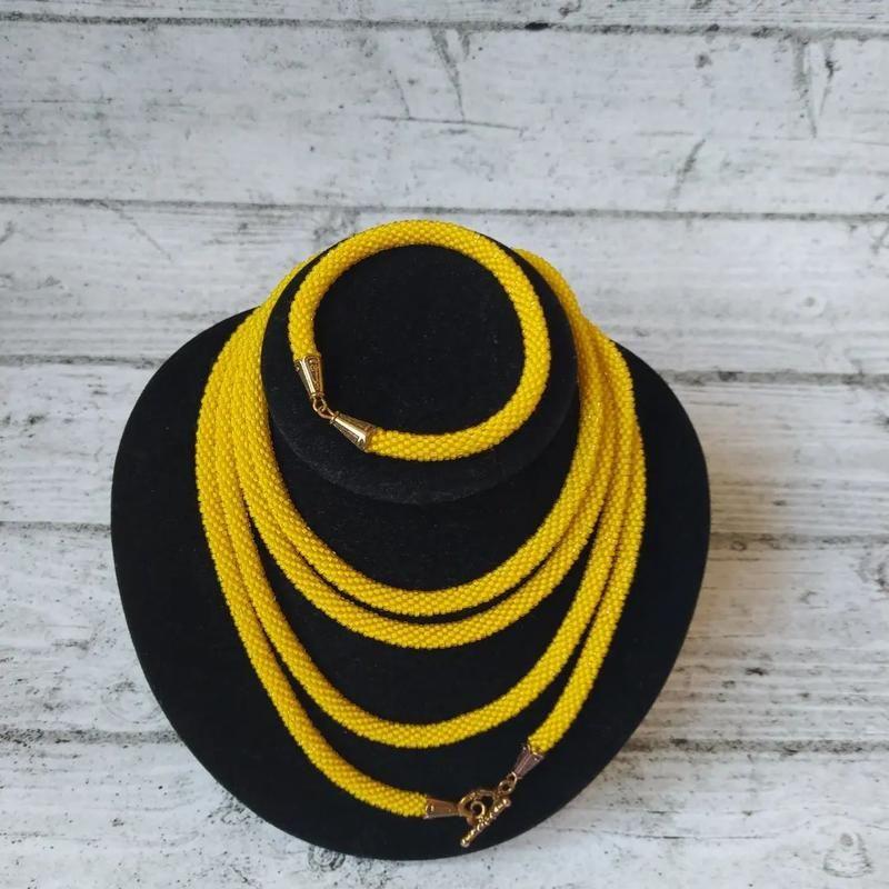 Насичений жовтий колір мені завжди нагадує літо. Ларіат чудово доповнить ваш образ, його можна носити на шиї як кольє або зав'язати різні вузли, також його можна носити на поясі, а браслет доповнить ваш образ Довжина шаріату 1.85 м браслет 25 см Ціна ларіату 550 грн Ціна комплекту 650 грн