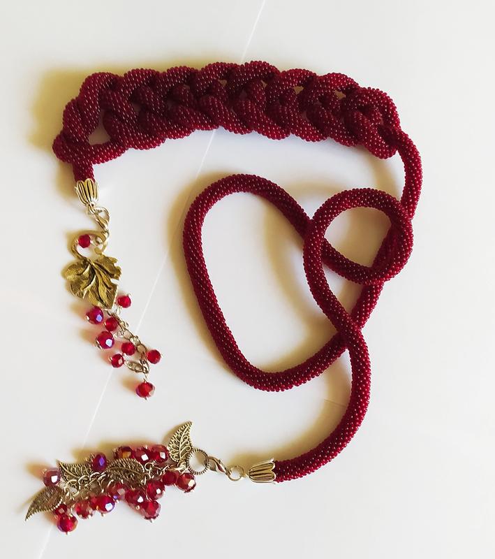 Ларриат из чешского качественного бисера, связанный на котоновой нити. Длина в<unk> завязанной части 150 см и подвески по 12 см, которые отстегиваются. Для подвесок использованы бусины и фурнитура, которые не утяжеляют украшение. Ларриат можно заплетать в косу, делать различные узлы, носить как пояс и таким образом каждый раз создавать новый образ, выглядеть стильно и ярко. Ларриат также будет хорошим подарком для женщины любого возраста. Для комплекта можно заказать браслет или серьги (цену уточняйте)