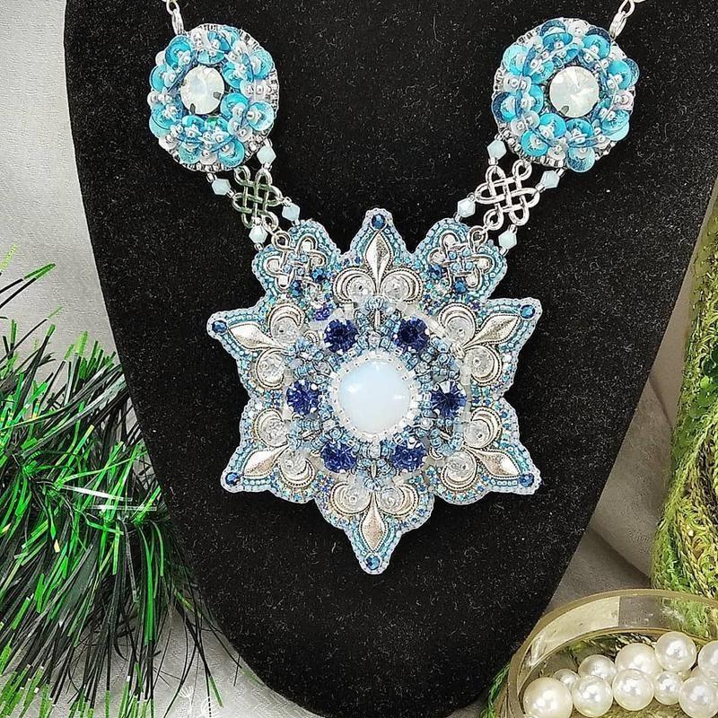 Новогоднее праздничное колье Снежинка❄️💎❄️ Нежноснежное колье... ❄️❄️❄️ Делалось не скажу что на одном дыхании...🙃 Складывала как пазл 😉 Серединка - опалитовое стекло 💎 оплетенное японским бисером Делика шёлковая. 💎🤍💎 В работе стразы 💎, фурнитура, стразовая цепочка ⛓️, хрустальные бусины рондели 🤍💙, пайетки 💙🤍, край обшит мельчайшим бисером Шарлотта , изнанка натуральная кожа 🔺🔺🔺 🙌 Ручная работа ❤️ Возможен повтор 💸 Стоимость 950 грн