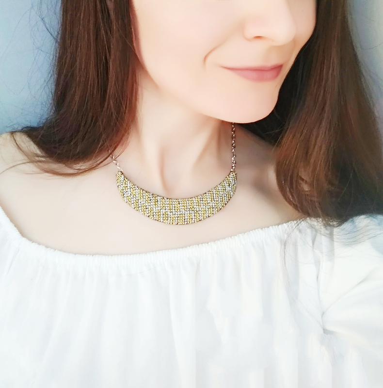 Ручная вышивка. Аксессуар изготовлен из канвы, золотистых и серебристых металлизированных нитей люрекс и серебристой цепочки. Колье довольно прочное. С внутренней стороны колье обшито черной креп-сатиновой тканью. Для застегивания аксессуара используется замочек-карабин. Размеры кулона – 10*2 см. Толщина кулона – 3 мм. Максимальный размер – 40 см (по желанию может быть изменен).