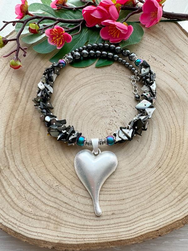 Кольє з перламутру та гематиту. Довжина 48 см + подовжувальний ланцюжок.