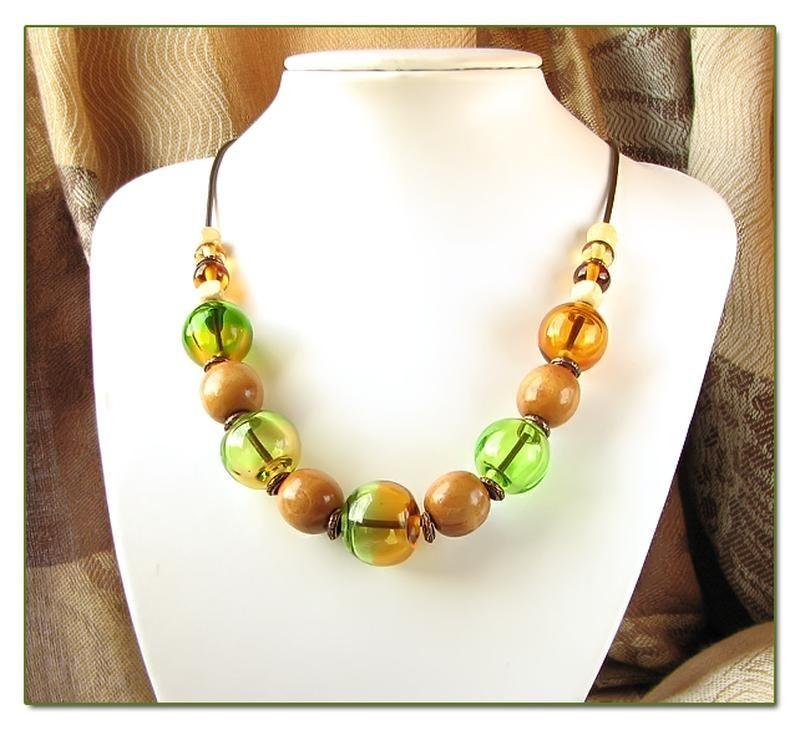 Бусы средней длины с полыми стеклянными бусинами в технике лэмпворк и деревянными бусинами. Основа - кожаный шнур коричневого цвета. Украшение дополнено фурнитурой цвета меди. Замок - маленький карабин. Бусы подойдут как к легкой светлой одежде, так и водолазке или тонкому свитеру. Диаметр больших бусин - 20-23 мм. Длина 64 см. Дополнительные характеристики: Цвет : Желтый Цвет : Зеленый Материал : Бусины Материал : Дерево Материал : Муранское стекло