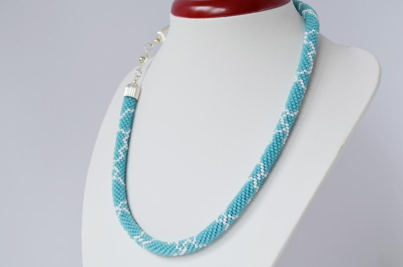 Оригінальна прикраса. Незалежно від стилю одягу, джгут незмінно приверне до себе увагу незвичайністю та вишуканістю. Індивідуальна річ, яка одразу надає образу граціозності, а зовнішньому вигляду – неповторності. В'язаний джгут. Довжина 49 см із застібкою. Діаметр 8мм. Джгут пов'язаний і якісного чеського бісеру.
