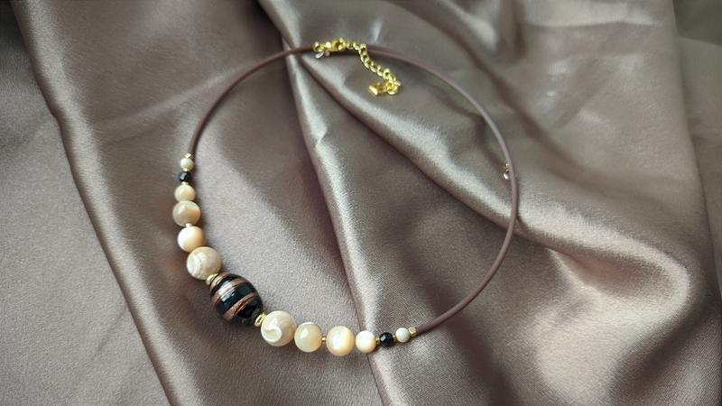 Кремовый перламутр и стеклчных бусина ручной роботы. Фурнитура с золочением. Дополнительные характеристики: Цвет : Коричневый Цвет : Черный Камни / вставки : Яшма Материал : Бусины