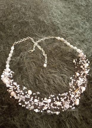 Ніжне кольє з річковими перлинами , кварцем, агатами, кришталевими амистинами та бісером. Додаткові характеристики: Камені / вставки: Перли Матеріал: Намистини Матеріал: Металева фурнітура Матеріал: Стеклярус