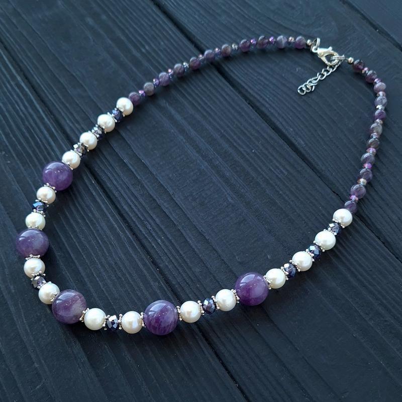 Класичне намисто з натуральних перлів високого класу, аметистів та кристалів. Довжина кольє - на ваше замовлення. Вартість вказана за кольє, довжиною 45 см +5 см подовжуючий ланцюжок, що дозволяє регулювати довжину. На інших фото є сережки, які не входять у вартість, але можуть бути замовлені окремо. До комплекту також можу зробити браслет. Додаткові характеристики: Колір: Білий Колір: Фіолетовий Камені / вставки: Аметист Камені / вставки: Перли Матеріал: Намистини