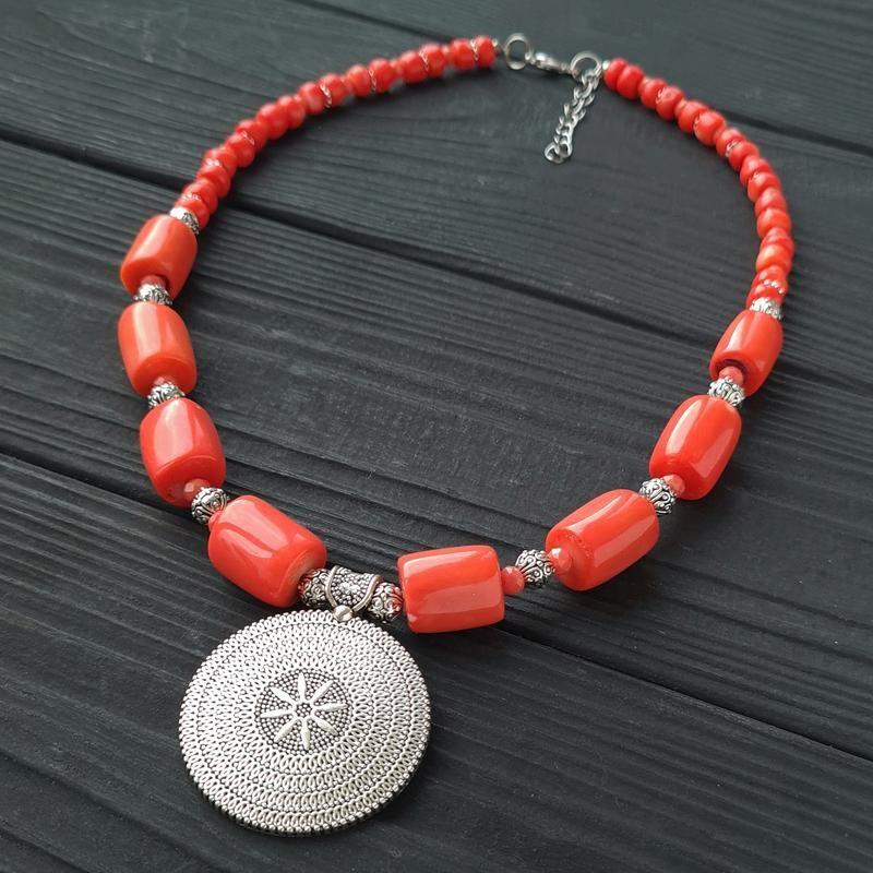 Бусы из натурального коралла цвета лосось с подвеской "цветок солнца"