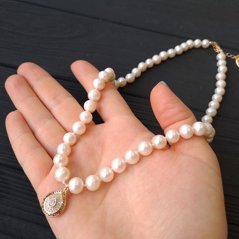 Розкішне святкове намисто з натуральних перлів з підвіскою у формі краплі. Кристал циркону сяє мов діамант. Вся фурнітура у кольє - якісна позолота по латуні. Вартість вказана за намисто як на фото, довжиною 47 см плюс подовжуючий ланцюжок 5 см. Перлини у кольє гарної якості, округлої форми,світяться природнім блиском. Клас перлів АА+ Кольє на шиї виглядає розкішно, перли яскраві не матові. Розмір перлин у намисті: 7.5-6.5 мм ( по центру - крупніше, на кінцях - менше). Роблю таке намисто з перлів, потрібної вам довжини. Кінцева вартість буде залежати від усіх побажань замовника. На інших фото є сережки, які не входять у вартість, але можуть бути замовлені окремо. В комплект до намиста можу зробити на замовлення браслет або сережки. Додаткові характеристики: Камені / вставки: Перли Матеріал: Намистини