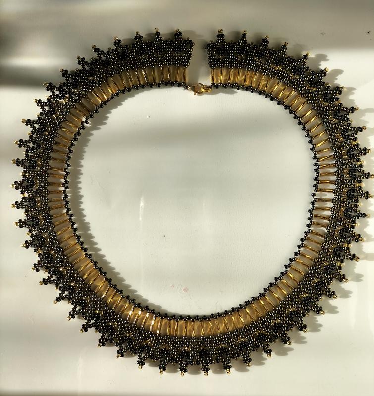 Прикраса на шию ручної роботи. Кольє з бісеру. Колір золотаво-чорний. Пересилка поштою. Мішечок з органзи в подарунок.