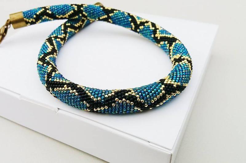 Шикарный жгут из качественного японского бисера Toho в том числе золотистым металиком со стойким к истиранию покрытием. Классическое сочетание ярко-бирюзового,черного и золотого сделают любой образ неповторимым Длина жгута вместе с замочком 49 см. Очень удобная застежка-карабин,позволит Вам без лишних усилий одевать украшение самостоятельно. Дополнительные характеристики: Цвет : Голубой