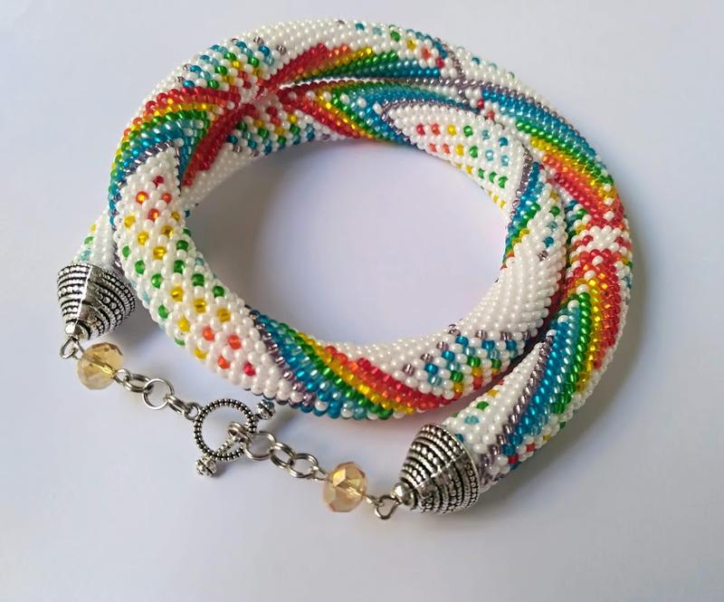 Жгут из чешского бисера на 15 бисеринок в кругу. Длина жгута 46 см, общая длина 50см. Один из вариантов использования цветов радуги в одном жгуте! Яркий жгутик принесёт яркие краски в ваш день, порадует оригинальностью, или вы можете кого-то из близких порадовать таким необычным подарком.