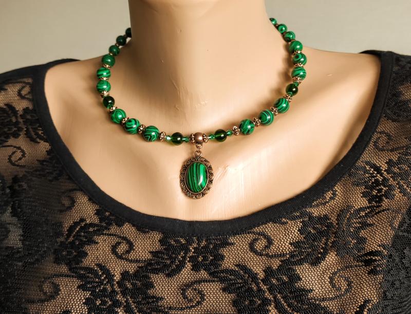 Кольє "Малахіт і мідь" зібране на меморі-дроті з зеленого малахіту в поєднанні з металевою фурнітурою рожевого кольору міді. Ці кольори - холодний зелений і теплий мідний - чудово доповнили і збагатили один одного. На мідному тлі темно-зелений малахіт набув яскравості і теплоти. В центрі кольє - підвіска з малахітом в мідній оправі. Довжина кольє - 43 см плюс 5 см подовжувальний ланцюжок. До цього кольє також пасує браслет, зібраний з аналогічних матеріалів (дивитись тут, на сайті). Нижче є фото браслета. Передоплата на карту Приват банку. Доставка Укрпоштою або Новою поштою за рахунок покупця.