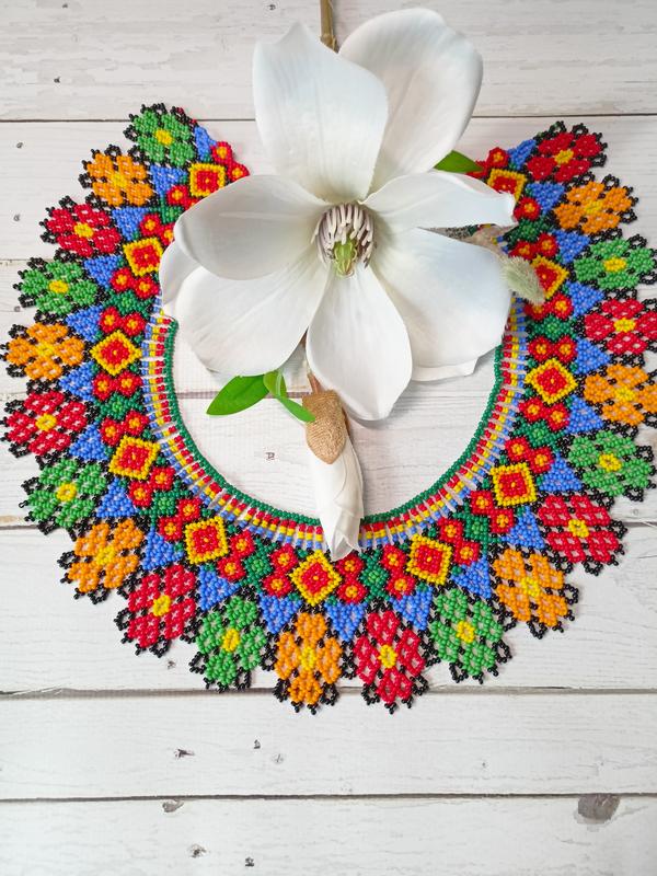 Силянка Соломія – прикраса ручної роботи виконана з чеського бісеру на віскозній міцній нитці. Силянка має замок карабін і подовжуючий ланцюжок. Довжина по шиї без ланцюжка – 38 см. Ширина – 7 см. Вага – 90 г.