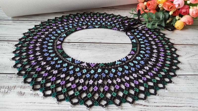 Довжина навколо шиї-38см. Ширина -8см. Зав"язки по-30 см, ними зручно регулювати довжину. Чеський бісер, міцна нитка. Товар виготовляється на замовлення.