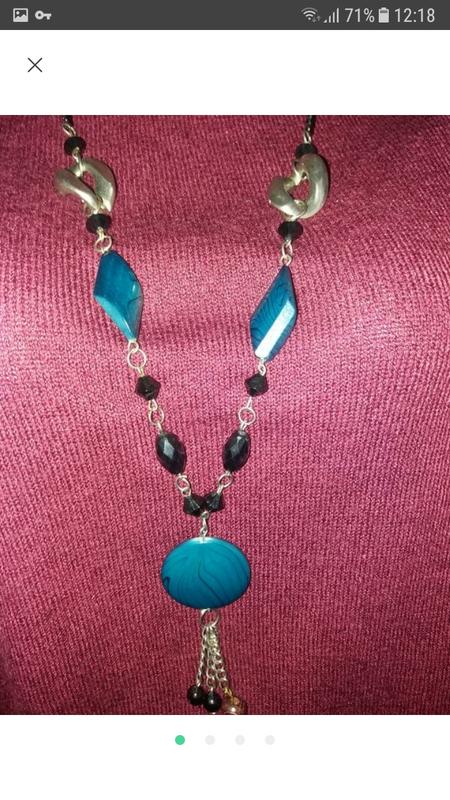 Подвес на цепочке- из 3 цветного пластика-черного.серебристого и темно сине зеленого цвета.Без застежки.Длина общая 85см.