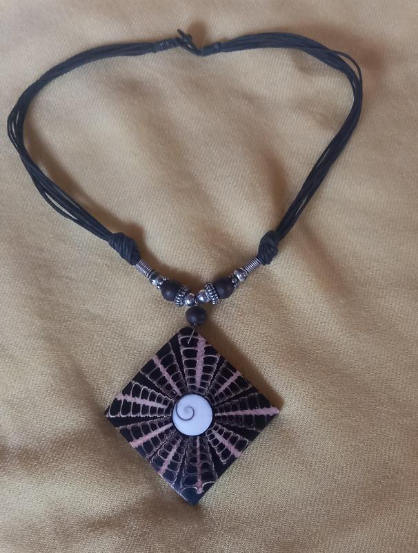 Оригінальне, цікаве колье. Підвіска із кори кокоса. Дуже гарно прикрашена натуральним перламутром. Стан- хороший. Довжина - 44 см. Вінтаж - 70- ті. Американський вінтаж.