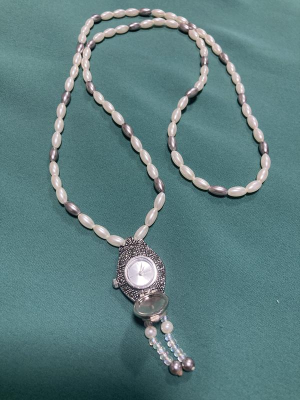 Часы кулон на ожерелье из искусственного жемчуга в серебряном тоне украшены марказитами