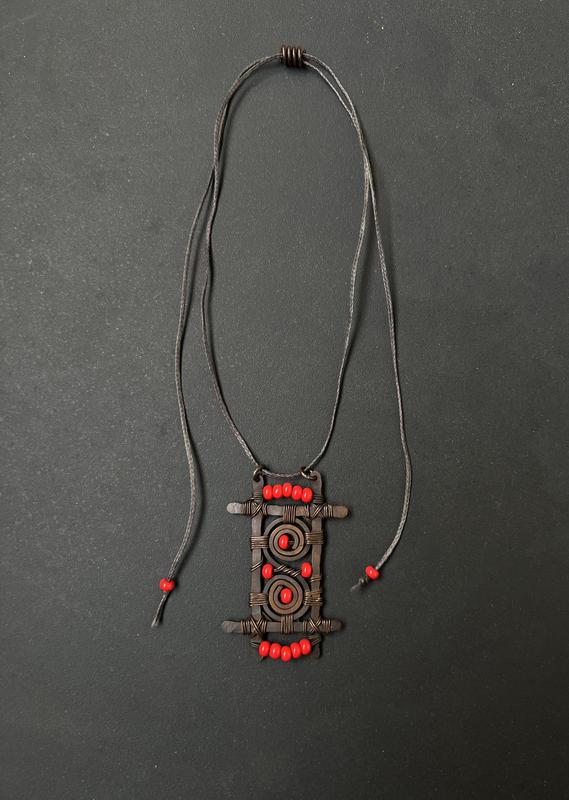 Підвіска зроблена з міді, ручної роботи. Оформлена яскравими бусинками. На тонкому, але міцному вощеному шнурку. Розмір кольє (обхват шнурочка в см) – 63 см. Не регулюється. Розмір підвіски: 5,5х3,5 см.