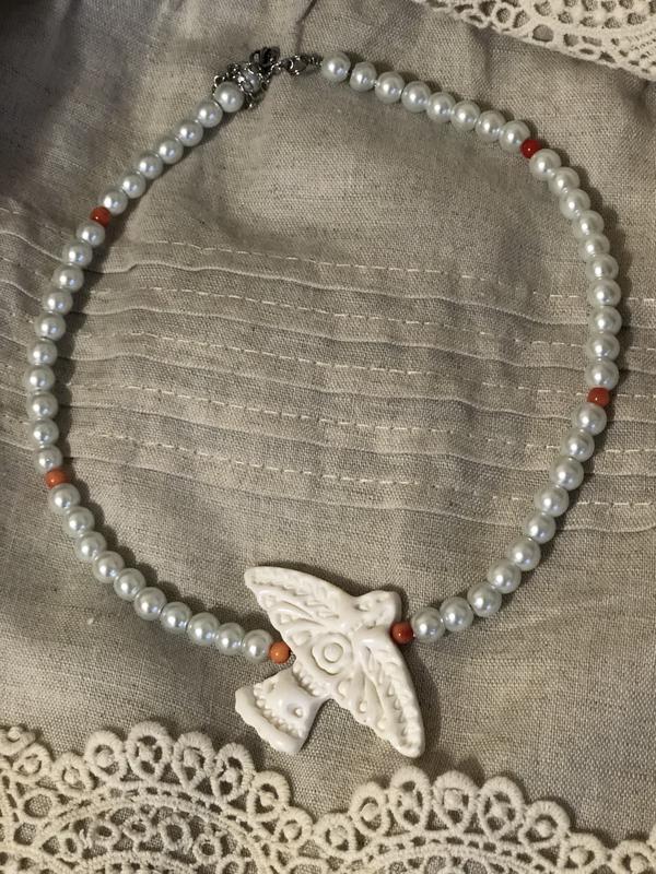 Сделано под заказ. Не вдягались жодного разу. Птичка - фарфор. Искусственные жемчуг и коралл.
