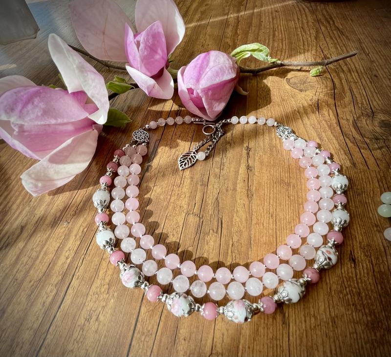 Ожерелье создано из трех видов кварца, бусин агата, гематита и фарфоровых бусин с росписью. Собрано на ювелирный тросик, замочек -тогл. Можно, при желании, одевать застежкой на бок. Длина кратчайшего звена 45 см.