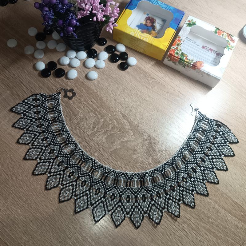 Силинка ручной работы. Украиское этническое украшение. Выполнена из белого, черного, серого чешского бисера. Длина по горловине 44см