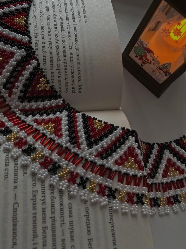 Довжина - 28 см + завʼязки, висота - 5,5 см. За рахунок завʼязок прикрасу можна підняти як чокер або опустити під комір. Робота виконана з бісеру який не витирається з часом. Можливе виготовлення в інших кольорах під ваші параметри.