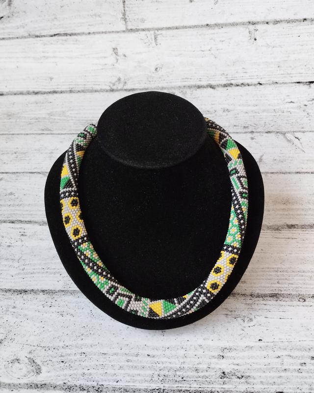 Жгут по мотивам пэчворк очень красиво дополняет ваш образ. Жгут вязаный из чешского бисера на хлопковой нити. Длина 50 см. В кругу 16 бисенок