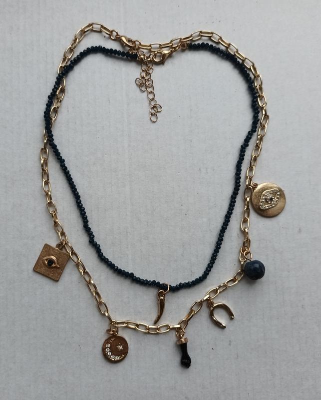 Отличный набор: колье чокер 2 шт Parfois в позолоте, с интересными разнообразными подвесками (в т.ч. натуральный камушок) и из мелких темно-синих граненых бусин чешского стекла - на солнце сверкает потрясающе. В реальности намного лучше смотрится чем на фото. Выглядит чрезвычайно стильно, отлично сочетается с другими украшениями. Тренд последних сезонов. Длина чокера из бусинок 38+3 см, цепочка с подвесками - 46+3 см. Также в наличии много действительно интересных эксклюзивных предложений — смотрите все мое объявления.