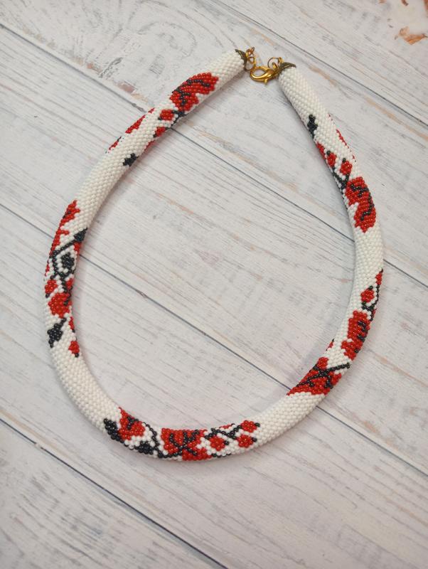 Жгут в белом цвете с красно-черным узором. Выполнен из чешского бисера