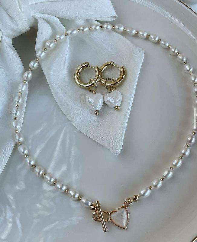 Колье из жемчужин и серьги с сердечками 🌷 •Материал колье - жемчужины натуральные речные 6*4,5 мм, ювелирный японский бисер, основа ювелирный тросик, фурнитура золото 18к •Материал серег - керамические подвески (сердечки), фурнитура сталь с покрытием (не темнеет) •колье 1200🏷️ •серьги 600🏷️