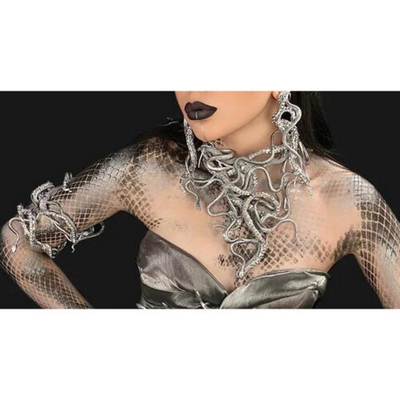 Стильний і незвичайне намисто у вигляді змії вигідно доповнить безліч повсякденних, класичних, романтичних та вечірніх вбрань. Атрибут можна носити як самостійно, так і в поєднанні з іншими сережками, обручами, кільцями та підвісками. Такий яскравий блиск гарантовано приверне увагу всіх оточуючих. Рельєфний малюнок надає атрибуту особливого шарму, лиску та оригінальності. Товар можна придбати як хороший подарунок, який сподобається будь-якій дівчині, незалежно від її віку і стилю, що віддається перевагі. Матеріал виготовлення виробу - резина. Всі аксесуари можна придбати окремо за додаткову плату.