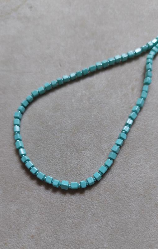 Чокер ручної роботи. Зроблено з використанням бісеру тайвань крупні бісерини і чеського бісеру, блакитного кольору, нагадує бірюзу. Довжина 37,5 см. Також можно довжину подовжити ланцюжком до 5 см.