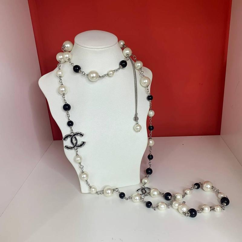 Подвеска-бусы черно-белая длинная с жемчугом и логотипами