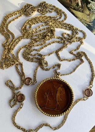 💛💛💛Рідкісна знахідка- розкішне трирядне кольє з підвіскою американської марки Goldette. Кольє виготовлене в кольорі античного золота, прикрашене крилами в оправі безель та підвіскою-інталією зі скла коньячного відтінку. ✨Засновником компанії «Goldette N.Y.» був Бен Гартнер - власник торгової фірми “Circle Jewelry Product Company “. В 1955 році він запустив лінію вишуканих прикрас під маркою “Goldette N.Y.” Прикраси виготовлялися в Род-Айленді, а розроблялися в Нью-Йорку. Дивовижні прикраси Goldette є бажаними для багатьох колекціонерів і хоча деякі з них були немарковані, ідентифікувати їх зовсім не важко. 💛Кольє в дуже хорошому стані, з незначними слідами часу. Маркування Goldette зі знаком копірайту. Америка вінтаж. Довжина найдовшого ланцюжка 90 см, підвіска 3,5 см.